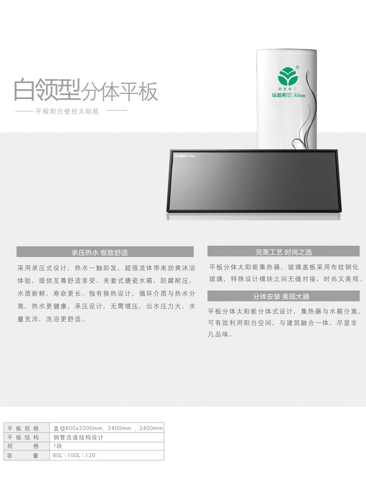 承压热水 极致舒适采用承压式设计,热水一触即发,超强流体带来劲爽沐浴体验,提供至尊舒适享受。夹套式搪瓷水箱,防腐耐压,水质新鲜,寿命更长。独有换热设计,循环介质与热水分离,热水更健康,承压设计,无需增压,出水压力大,水量充沛,洗浴更舒适。